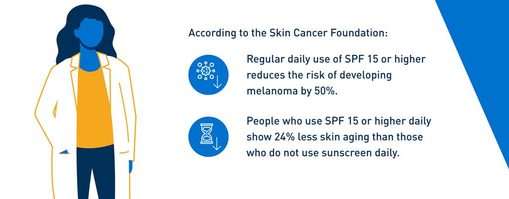 According to the Skin Cancer Foundation4, regular daily use of SPF 15 or higher reduces the risk of developing melanoma by 50%, and people who use SPF 15 or higher daily show 24% less skin aging than those who do not use sunscreen daily.